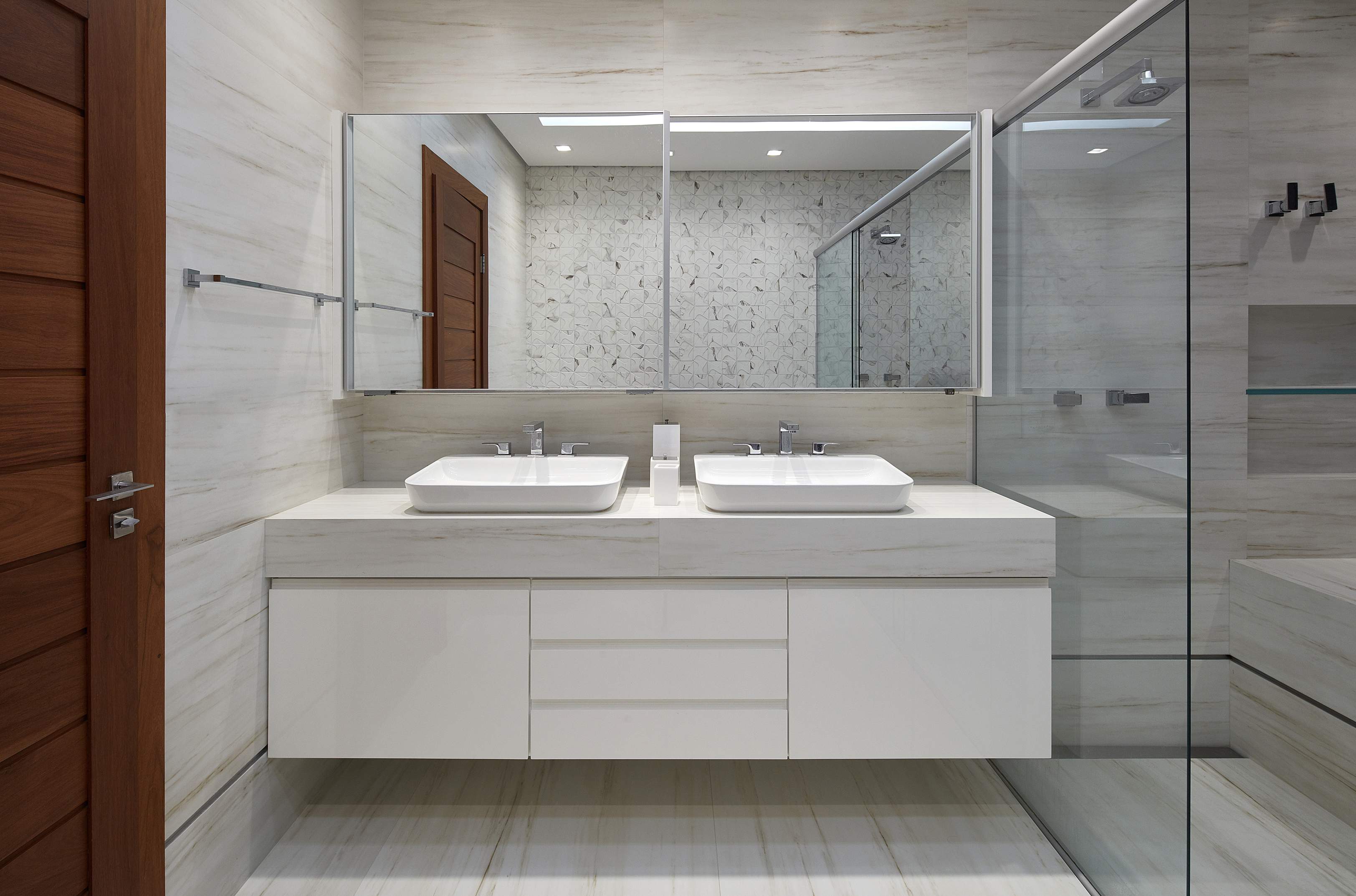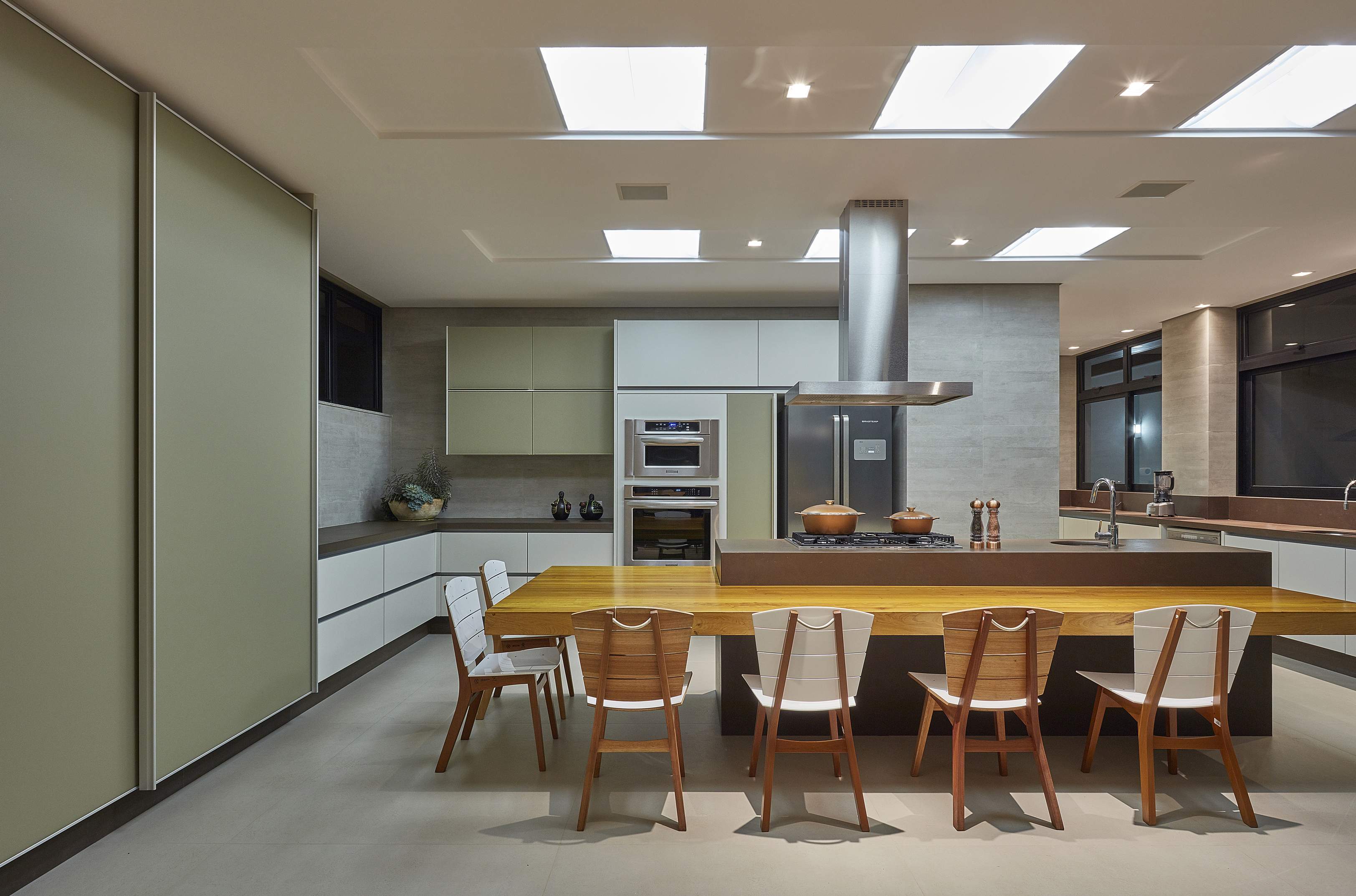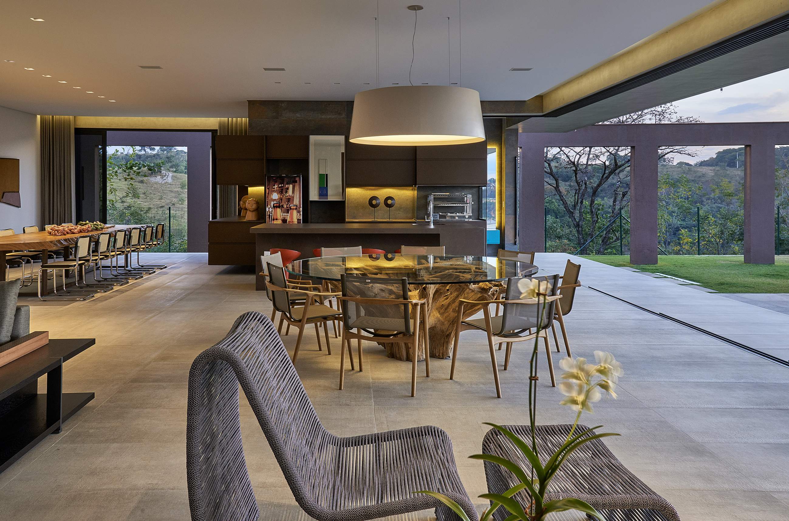 A implantação em “Y” garantiu que a setorização das áreas fosse bem caracterizada, com independência e funcionalidade de uso. Uma rampa leva ao amplo salão social centralizado, com home cinema, jantar e varanda gourmet. A ala íntima possui quatro suítes, um escritório e uma copa noturna na circulação com iluminação zenital para o conforto visual durante o dia.