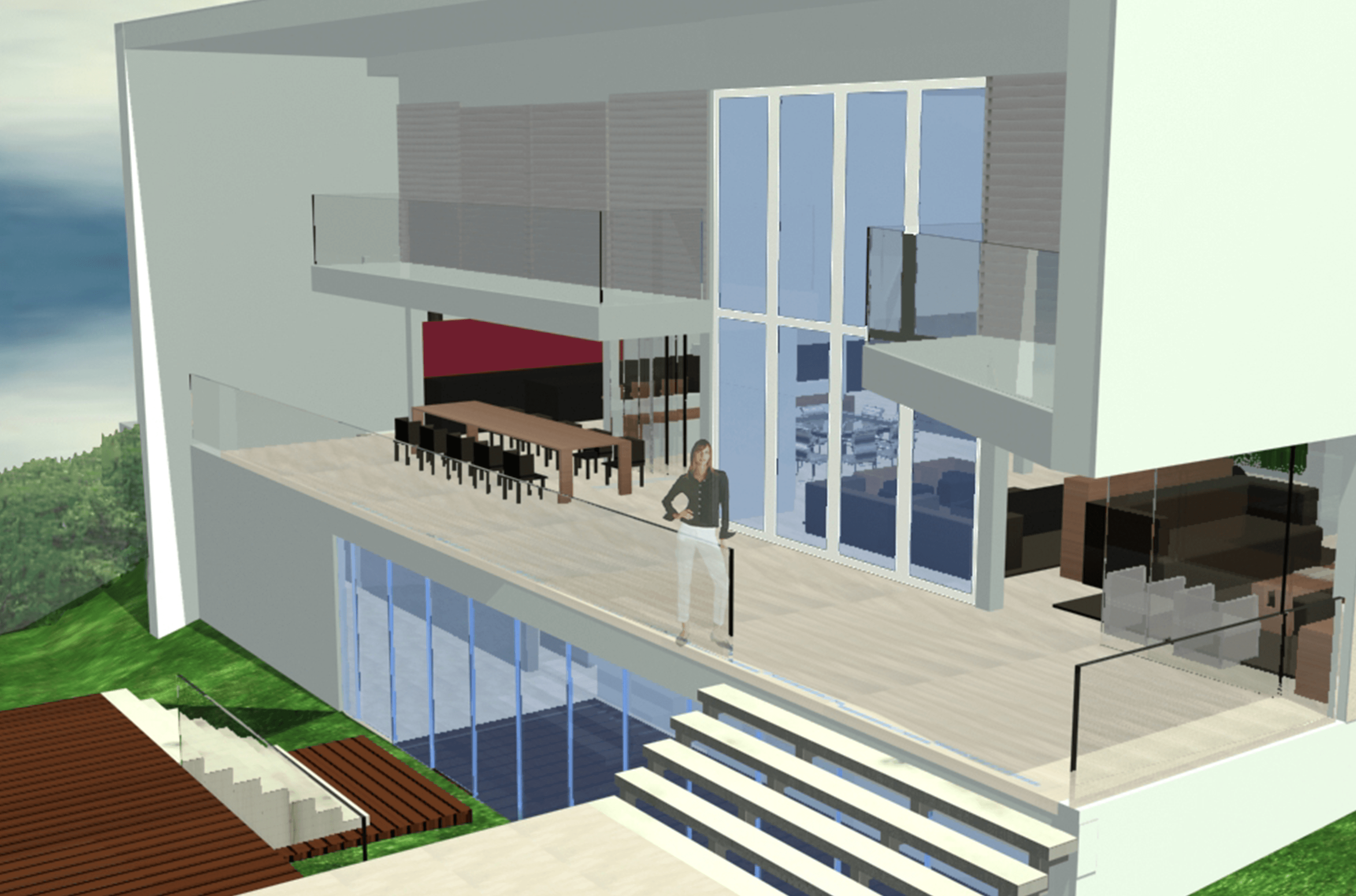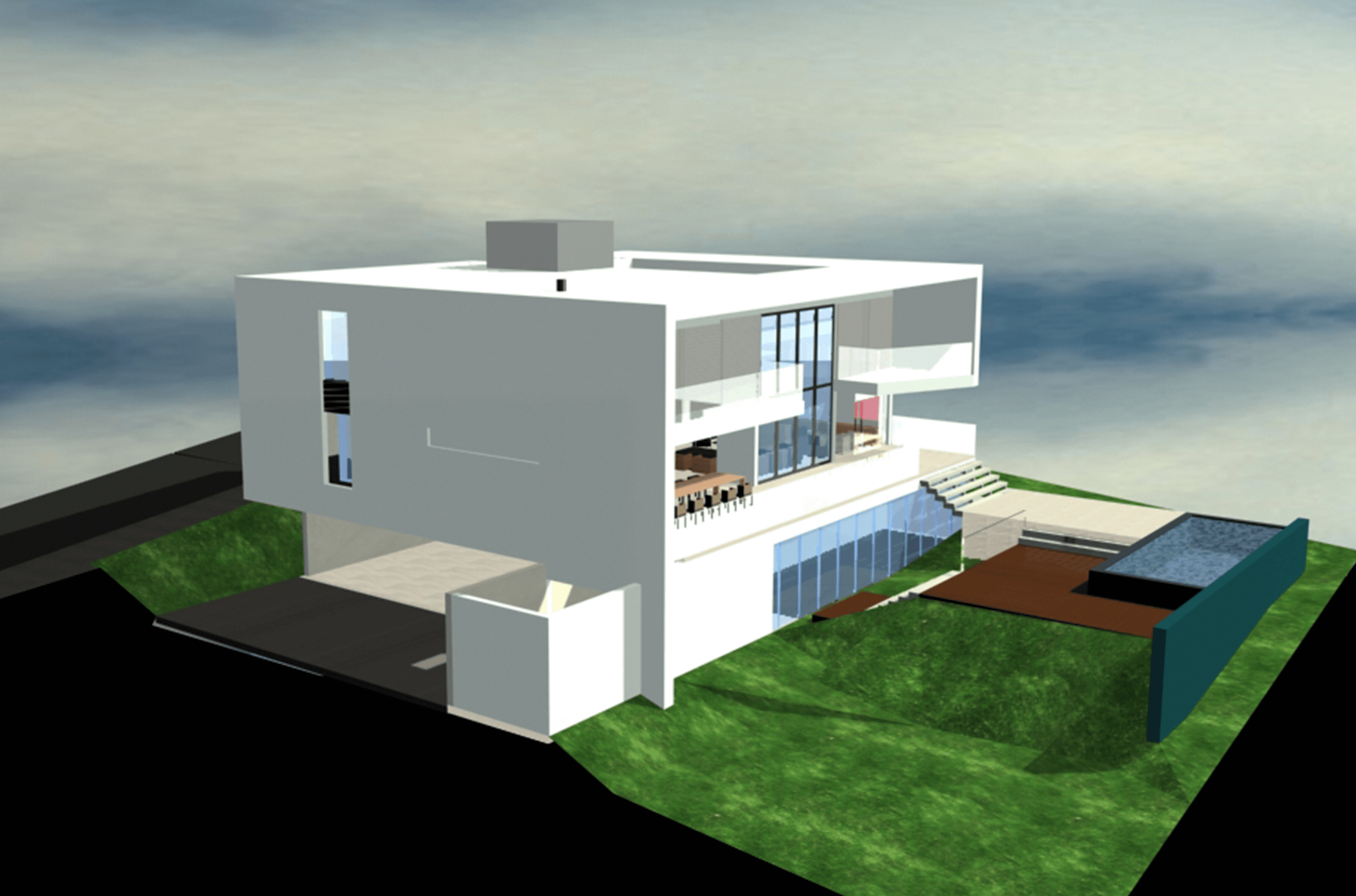 O acesso à garagem se dá através do ponto mais baixo do terreno, pelo aproveitamento da topografia, recebendo as dependências de serviço, sauna, ducha e depósito.