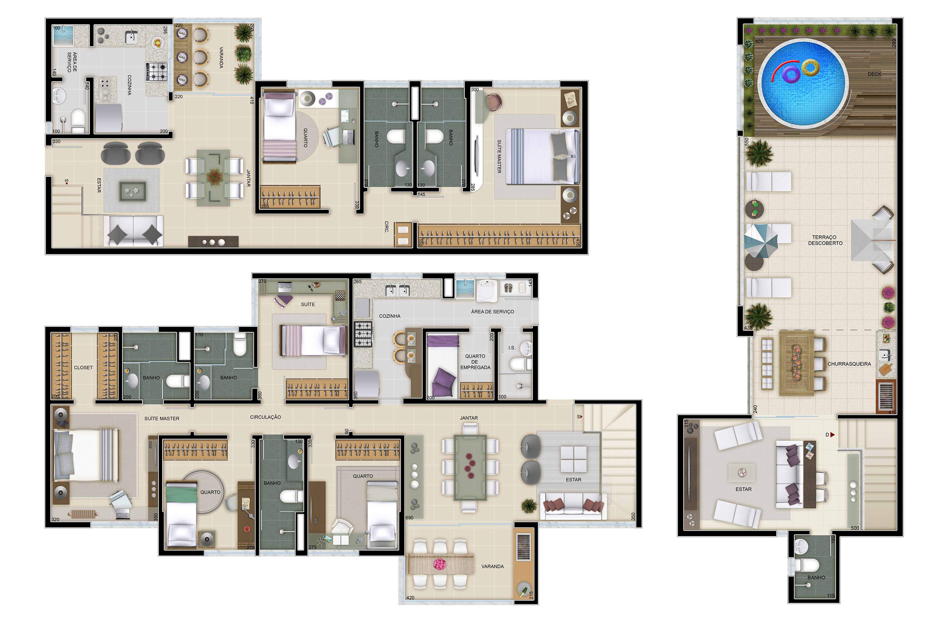 A planta foi distribuída em três pavimentos: no primeiro, foi situada a garagem para dois veículos e a área social, com ampla varada e uma setorização por ambientes – jantar, estar e escritório; no segundo pavimento foram dispostos os dormitórios; e no nível inferior, foi localizada a área de lazer, com piscina, cascata, varanda com churrasqueira, estar, quarto de brinquedos, vestiário, sauna e ducha.